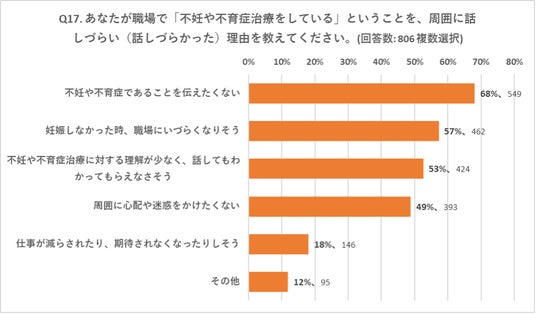 その理由で最も多いのは、「不妊や不育症であることを伝えたくない」(68%)。「妊娠しなかった時、職場にいづらくなりそう」(57%)、「不妊や不育症治療に対する理解が少なく、話してもわかってもらえなさそう」(53%)と続く(Q17)。(図11~図13参照)