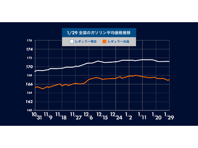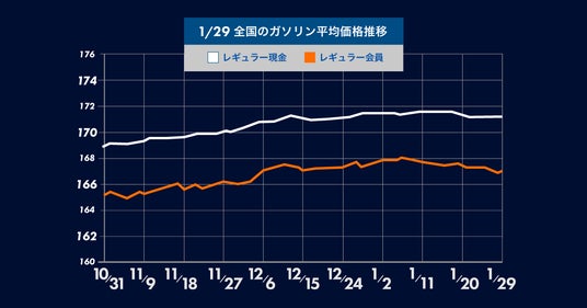 1月29(月) 時点のレギュラーガソリンの全国平均は、171.2円となり先週から変わらず横ばいとなりました。
