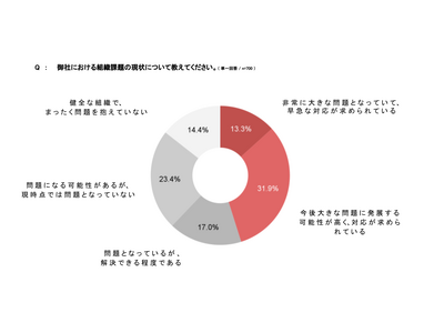 人材育成、離職率、従業員満足度などの組織課題に対して、緊急に対応が必要視される「非常に大きな問題となっていて、早急な対応が求められている」企業が13.3%、「今後大きな問題に発展する可能性が高く、対応が求められている」が31.9%と回答しています。