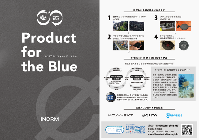 この度、一般社団法人ALLIANCE FOR THE BLUE(代表理事:野村 浩一、所在地:港区)と連携し、廃棄漁網をリサイクルした再生プラスチックを用いたコースターを制作しました。 今後も廃棄漁網を活用した素材の使用を積極的に取り入れ、環境に配慮したものづくりをより一層強化してまいります。