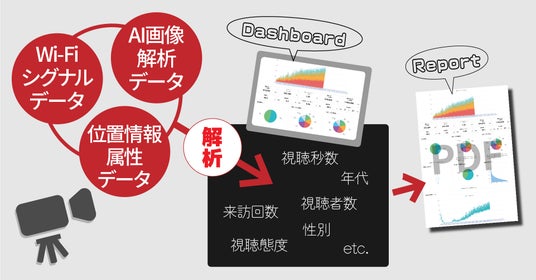 『OOH Analytics』はこれらのビッグデータを解析し、指定した日時分秒(例えば広告の出稿時間)における、視聴者数・性別・年代・来訪回数・視聴秒数・視聴態度などの解析データを把握できます。これらの解析データは専用ダッシュボードにおいてリアルタイムかつ直感的に確認でき、さらに「レポート作成機能」でPDF形式でのレポートを出力することで、広告主(広告会社)への報告ができるようになっています。