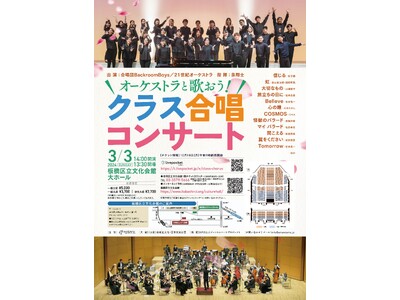 「オーケストラと歌おう!クラス合唱コンサート」を開催いたします。日本の小・中学校に通っていた方は必ず歌ったことがあるクラス合唱の名曲を、泉翔士が率いる気鋭の若手演奏家集団「21世紀オーケストラ」と、楽曲に込められたメッセージを情熱的に歌い上げる合唱団「BackroomBoys」が演奏します。