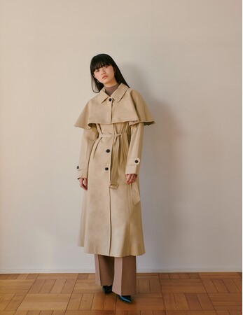 コットン100%柔らかいトレンチ生地を採用。ケープ、コートのドレープを美しく出せるよう生地を選びました。サイズもオーバーではなくジャストめにすることで綺麗なシルエットを演出してくれるアイテムになっています。