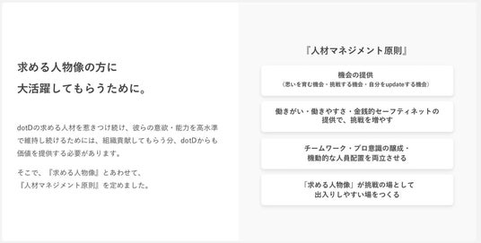 会社へ貢献してもらう対価としてdotDからも価値を提供する必要があると考えており、dotDでは「人材マネジメント原則」を定めています。全社員へ「機会の提供」「働きがい・働きやすさ・金銭的セーフティーネットの提供」など社員の意欲・能力を高水準で維持し続けてもらうことで、より活躍してもらうための環境づくりを心がけています。