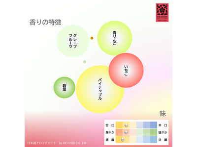 レボーンの専門家が開発した、日本酒の香りの厳密な基準に基づく官能評価をもとに、分かりやすいチャートに表現したもの。買う前・飲む前に、または飲みながら、日本酒が持つ繊細で豊かな香りを多くの方々に楽しんでいただく目的。将来的には、レボーンのセンサーとAIによりチャートの自動生成を目指す(開発中)。