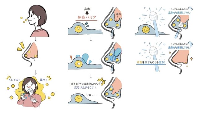 StandardBrush(鼻腔内専用ブラシ)は鼻粘膜に付着した異物を物理的に洗浄できる製品です。花粉症の薬は鼻水やくしゃみをおさえますが、この鼻腔内専用ブラシは8.4万本の極細ナイロン毛が実現するふわふわの洗い心地でそもそもの引き金となる異物を高次元に洗浄、鼻環境を根本から整えます。(一般的な歯ブラシの毛量は500~1000本)
