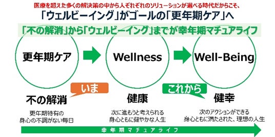 「更年期ケア」とは更年期の症状の「不の解消」だけでなく、その先の「ウェルビーイング」までと捉えることが重要であると認識し、この「健幸ウェルビーイング」への気づきとアクションを促すことがマチュア世代にとっての「更年期」を「幸年期」へと変化させることにつながります。この考えに共感できる方に「幸年期ファシリテーター」となり参画いただきたいと考えます。
