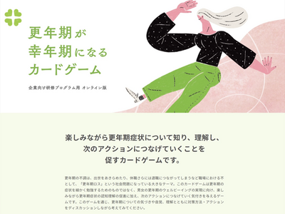 当プログラムは「座学+カードゲームワークショップ+更年期ロスを生まないDE&I視点でのキャリアサポートワークショップ」によって構成され、参加者それぞれが「更年期の症状があることによってどのような変化や不調があるのか」そして「それを良くするために、どのようなアクションができるのか」を、参加者同士がディスカッションし、個人や組織の気づき・対処やアクションを促し、不調に悩む当事者のキャリアデザインに活かされ、幸年期を過ごすように、また更年期ロスのない、働きやすい、そして働き続けられる環境づくりを考えていただきます。このプログラムを、リアルの場だけではなく、今回オンラインのワークショップでも実施できるようになります。