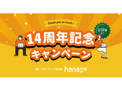 株式会社アンフープ(所在地:静岡県富士市、代表取締役社長:重森 渉)がサイト運営する、オンライン英会話スクール「hanaso(ハナソ)」は、サービス開始から14周年を迎えました。日頃の感謝を込めて、2024年2月20日(火)~3月27日(水)に、新規に有料会員へご入会、または、再入会いただいた方を対象としてどのプランでも月額料金が初月のみ半額(税込2,490円~)&抽選で10名様に3,000円分のAmazonギフト券プレゼント!の 「14周年記念キャンペーン」を実施いたします。