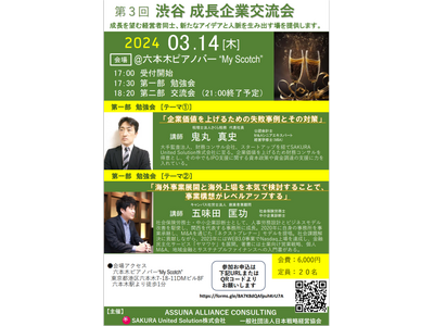 SAKURA United Solution株式会社、および一般社団法人 日本戦略経営協会は、成長・IPOを目指す起業家と、経営支援専門家が交流する場として、「渋谷成長企業交流会」を2024年3月14日(木)に六本木ピアノバー MY SCOTCHにて開催いたします。