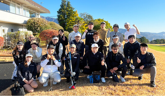 馬場咲希選手とプロキャディー進藤大典氏を囲んでゴンドラ社員と写真撮影(2023年12月)