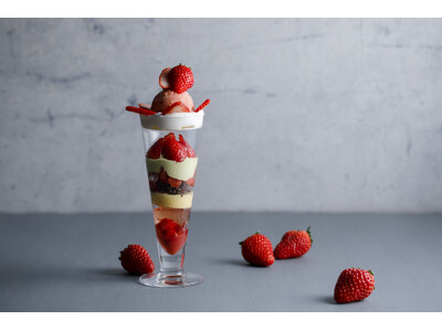 生いちごをたっぷり使用し、いちごの甘酸っぱさと香りが口の中いっぱいに広がるパフェです。メレンゲのサクサク食感とロゼワインジュレの大人の味わいに、気分まで春めきます。