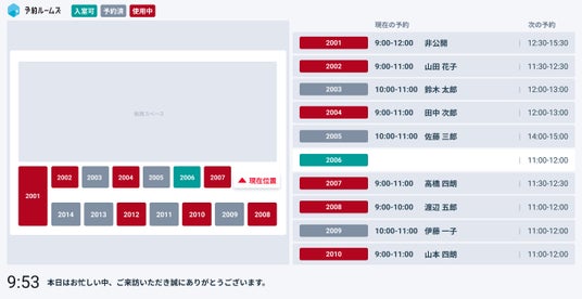 今回新たにリリースされた サイネージモード「フロアマップ機能」は、各企業ごとの会議スペースの配置図をもとに、予約者・利用状況を色別で可視化できる機能です。