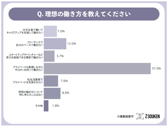 アンケートにて「理想の働き方を教えてください」と尋ねたところ、『プライベートも重視しながらやりがいを持って働きたい(57.0%)』が最も多く、次いで『フリーランスで自分のペースで働きたい(12.0%)』が多い結果となりました。