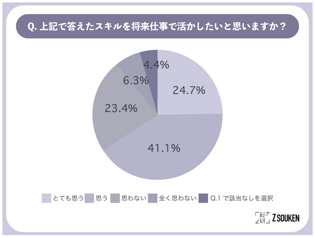 アンケートにて「上記で答えたスキルを将来仕事で生かしたいと思いますか?」と尋ねたところ、『思う(41.1%)』が最も多く、次に多い回答が『とても思う(24.7%)』という結果になり、アンケートに回答したZ世代の65%以上がデジタルスキルを将来仕事で生かしたいと思っていることがわかりました。