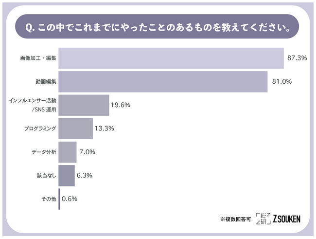 アンケートにて「この中でこれまでにやったことのあるものを教えてください」と尋ねたところ、『画像加工・編集(87.3%)』と回答した方が最も多く、次いで『動画編集(81.0%)』という結果になりました。