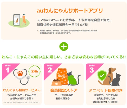 本サービスは月額550円で、スマートフォンのGPSでペットの散歩ルート・距離の自動測定や健康状態管理ができる「auわんにゃんサポートアプリ」のほか、24時間年中無休で獣医師などに電話相談が可能な「わんにゃん相談サービス」、ペットフードなどをおトクに買える「会員限定ストア」、ペットの怪我の治療費をサポートする「ミニペット保険」のサービスをセットで利用できます。