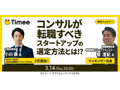 ヤマトヒューマンキャピタル株式会社(本社:東京都千代田区、代表取締役:堀江 大介)は、2024年3月14日(木)20:00よりオンラインにて、株式会社タイミー代表取締役小川嶺氏、事業戦略本部事業戦略グループ マネージャー堀澄紀氏にご登壇いただくウェビナー『 コンサルが転職すべきスタートアップの選定方法とは!?』を開催いたします。