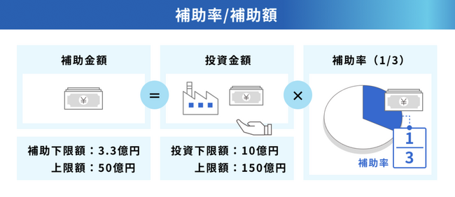 大規模成長投資補助金では、工場の新設や改修、大規模な設備投資に必要な費用が補助対象となり、補助上限50億円、補助率1/3で補助を受けることができます。