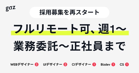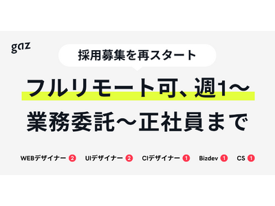 想いをデザインで可視化する、株式会社gaz(ギャズ)は2024年3月7日より東京支社の開設予定に伴い、全国を対象とした東京メンバー/福岡メンバー/リモートメンバーの採用募集及び、CxO、UI Designer、Web Designer、BizDev、CSなど全職種の採用募集を再開したことをお知らせします。