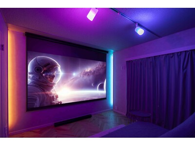 スクリーン設置壁面の間接照明と、天井スポットライト(ライトの数を増設可能)をスマートフォンで操作可能。映画鑑賞には暗く落ち着いた照明、スポーツ観戦には明るく活気ある照明といったように、光の色と明るさを自在にコントロールし、シーンや視聴するコンテンツに合わせた空間演出が実現します。