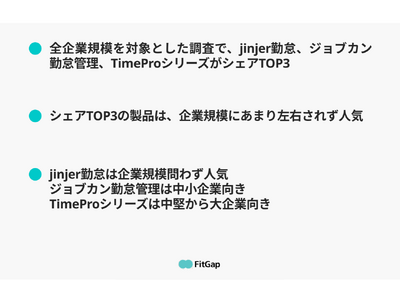 【クラウド勤怠管理システム市場シェア調査】上位3製品は企業規模問わず上位をキープ。企業規模、事業規模に応じたニーズに対応できるシリーズ展開製品が根強い人気。