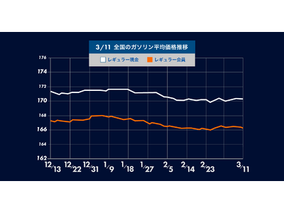 3月11日(月) 時点のレギュラーガソリンの全国平均は、170.3円となり先週から0.3円の値上がり。8週間ぶりの値上がりとなりました。
