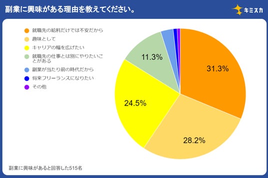 副業に興味がある理由は、「就職先の給料だけでは不安だから」が最も多く31.3%で、その次に「趣味として」と「キャリアの幅を広げたい」が続いた。