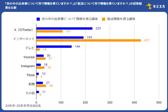 世の中の出来事について・就活について情報を得ている媒体の比較