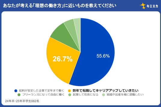 「給料が安定した企業で定年まで働く」が1位で55.6%を占めたものの、「数年で転職してキャリアアップしていきたい」が2位で26.7%を占める結果にもなった。