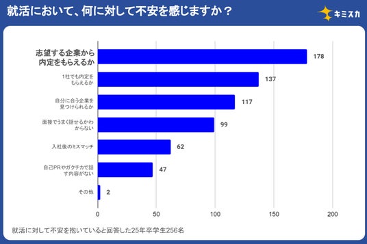 先ほどの問いで「とても不安・やや不安」と回答した25年卒学生256名から、具体的に何に対して不安を感じるかも調査した。(3つまで複数回答可能)
