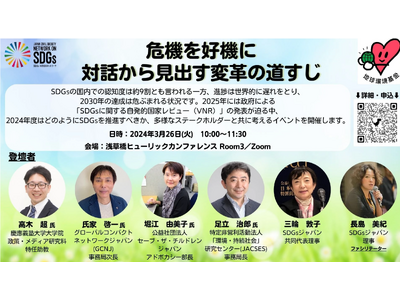 一般社団法人SDGs市民社会ネットワーク(東京都千代田区、共同代表理事:大橋正明、三輪敦子)は、26日に都内でハイブリッドイベント「危機を好機に~対話から見出す変革の道すじ」を開催します。2025年には政府による「SDGsに関する自発的国家レビュー(VNR)」が予定される中、2024年度はどのようにSDGsを推進すべきかを、様々なステークホルダーと対話し、共に考えます。