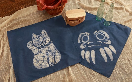 初心者の方でも描きやすいよう、絵柄の大きさや線の太さに配慮し、特に面の部分を大きく取って、”ろうけつ染め”ならではの“ろうのひび割れ”を楽しめ、その繊細さと美しさを表現できるようにしました。また、染める図案は縁起物の「達磨」と「招福猫」の2種類をご用意。どちらかを選んで制作していただけます。