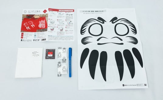 キットの内容物:染料、ハンカチ、図案付きの説明書、消えるマーカーペン