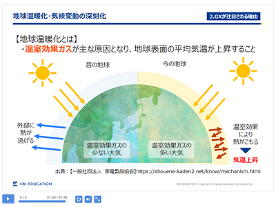 企業向けの教育・研修サービスを開発・提供している関西ビジネスインフォメーション株式会社(大阪府大阪市、代表取締役社長:武枝 和彦、以下「当社」)は、今後企業の取り組みとして求められるGX(グリーントランスフォーメーション)をテーマにしたeラーニングコースの提供を開始いたしました。GXを推進できる人材を育成するため、GXの基礎的な知識や企業が環境問題に取り組む意義について学べるカリキュラムです。