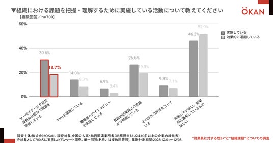 OKANが2023年12月に実施した調査※1によれば、組織課題把握にサーベイツール等の調査を実施している企業が30.6%である一方、効果的に運用できていると答えた企業は18.7%に留まっています。「ハタラクカルテ」は、これまでもサーベイ結果を活用したリテンションマネジメント施策のサポートを行ってまいりましたが、複数回のサーベイを実施して組織課題を把握した企業でも、活用や制度改善など運用面に難しさを感じているケースは少なくありません。