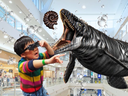 今話題の最先端デバイスであるARグラスをかけると、目の前の世界にARコンテンツが登場します。海の覇王とも呼ばれる恐竜・モササウルスの迫力を等身大スケールで体験できます。手のアクションに反応して、名前を表示したり、近寄ってきたりと楽しむことができます。