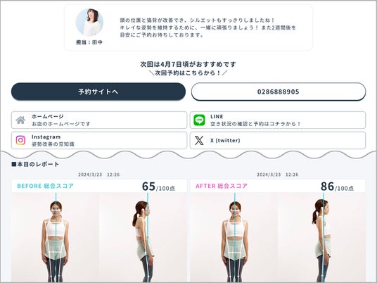 AI姿勢分析という新しい体験と、自分が何点なのか?点数が出る時のドキドキ感を提供できます!今後の施術計画を立てる際にお役立てください。