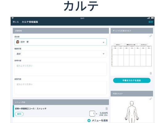 施術内容の入力、メニュー登録と自動計算、手書きカルテを残すことができます