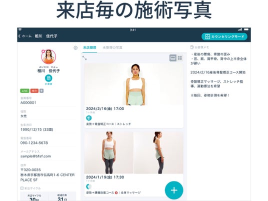 カルテ管理・問診票(カウンセリングシート)・デジタル同意書の機能もご好評いただき、エステサロン・整体院・スポーツジムやパーソナルトレーニングジムなど35,000店舗以上の店舗様に導入をいただいております。