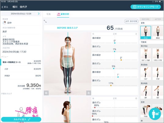 お客様は自分の姿勢スコアと写真から歪みの状況を先生と一緒に理解することができます。