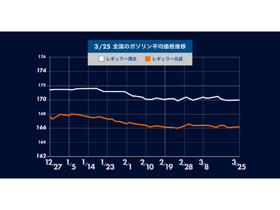3月25日(月) 時点のレギュラーガソリンの全国平均は、170.0円となり先週から変わらず横ばいとなりました。