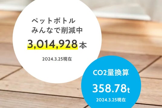 私たちは、一人一人の水を飲む毎日の小さな行動の積み重ねが、大きな力となっていくことを実感していただきたいと考えています。そのため、2021年10月の発売から、「ペットボトルみんなで削減中」の進捗(想定される削減本数)とそのCO2量換算値をスミッチのホームページで公開しています※。これまでに、スミッチユーザーによるペットボトルの削減本数は3,014,928本に達し、これはCO2で358.78トンの削減に相当します。