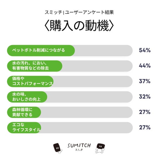 購入動機として最も多かったのは「ペットボトル削減につながる」で、利用者の半数以上がペットボトルの削減を動機にスミッチを購入しています。さらに使用後では、「水の味、おいしさの向上」が71%と評価の中で最も高く、スミッチの提供する水の品質に対する満足度が高いことを示しています。また、製品の使用によりユーザーが、森林循環に対する意識が高まり、エコな生活スタイルの良さを実感していることも読み取れます。