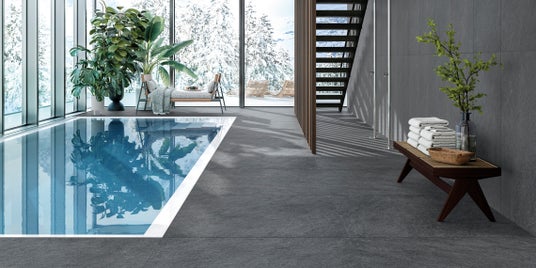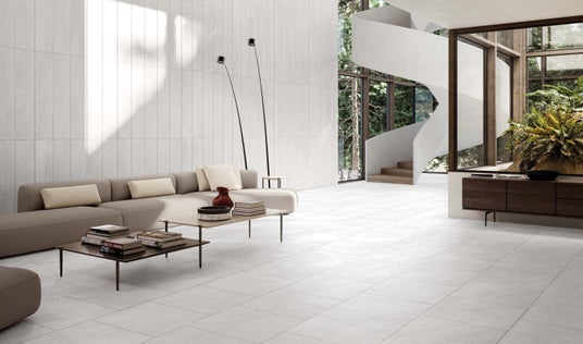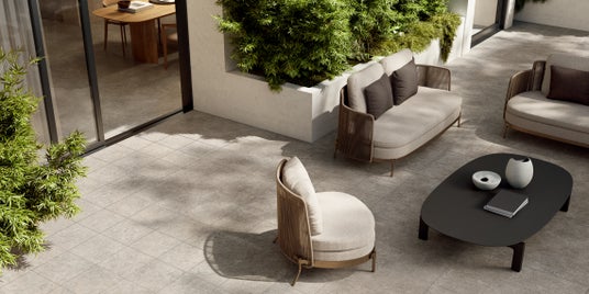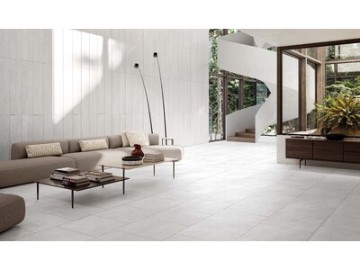 室内の床や壁とエクステリアを同じシリーズを使用することで、リビングから外部までの空間をひと続きにし、開放的な空間を演出します。新シリーズ「プライマル」では、駐車場など屋外用途に対応した厚み20mmのタイルをご用意し、耐久性が求められる公共施設での使用にも適しています。