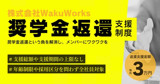 株式会社WakuWorks(本社:東京都千代田区、代表者:鈴木悠介/以下、「当社」)は、福利厚生の一環として独立行政法人日本学生支援機構(JASSO)の貸与奨学金を対象とした奨学金返還支援(代理返還)制度を導入したことをお知らせ致します。