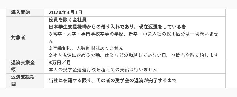 年齢や勤続年数を問わず全社員対象。2024年3月から奨学金返還支援を開始。