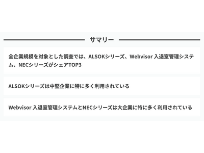 受付・入退室管理システムの全ての製品の企業規模ごとの市場調査は、1人から99人の中小企業、100人から999人の中堅企業、1000人以上の大企業を対象としました。計2,379件の有効回答を集計した結果、ALSOKシリーズが8.7%でした。次いでWebvisor 入退室管理システムが8.4%で、NECシリーズが7.9%でした。