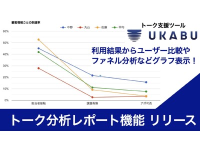 株式会社UKABU(東京都渋谷区 代表取締役:丸山 隼平)が提供するAI搭載のトーク支援ツール「UKABU(ウカブ)」 は、見ながら顧客対応をしたユーザーの利用結果ログから、トークスクリプトの様々な分岐点を簡単にグラフ表示し、集計・分析できる「トーク分析レポート機能」をリリースいたしました。