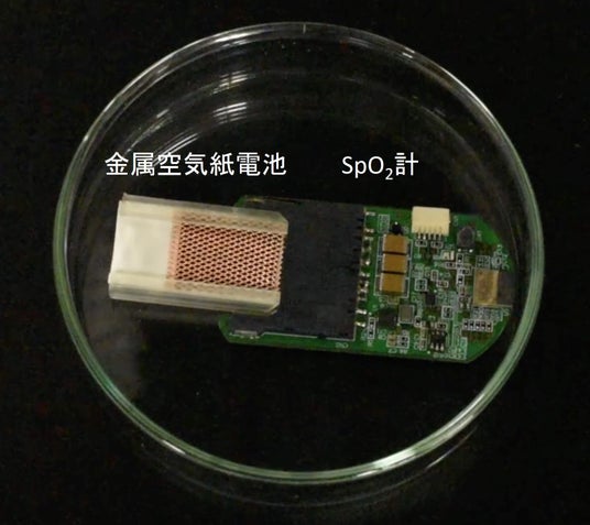 ※紙の表面に正極を形成し、反対側に亜鉛負極を配置する「金属空気紙電池」はこれまでも報告されていましたが、電圧や出力が不足(一般的な単三乾電池の電圧1.5Vに劣る、出力が µW/cm2 レベルなど)しており、実用に耐えるものではありませんでした。